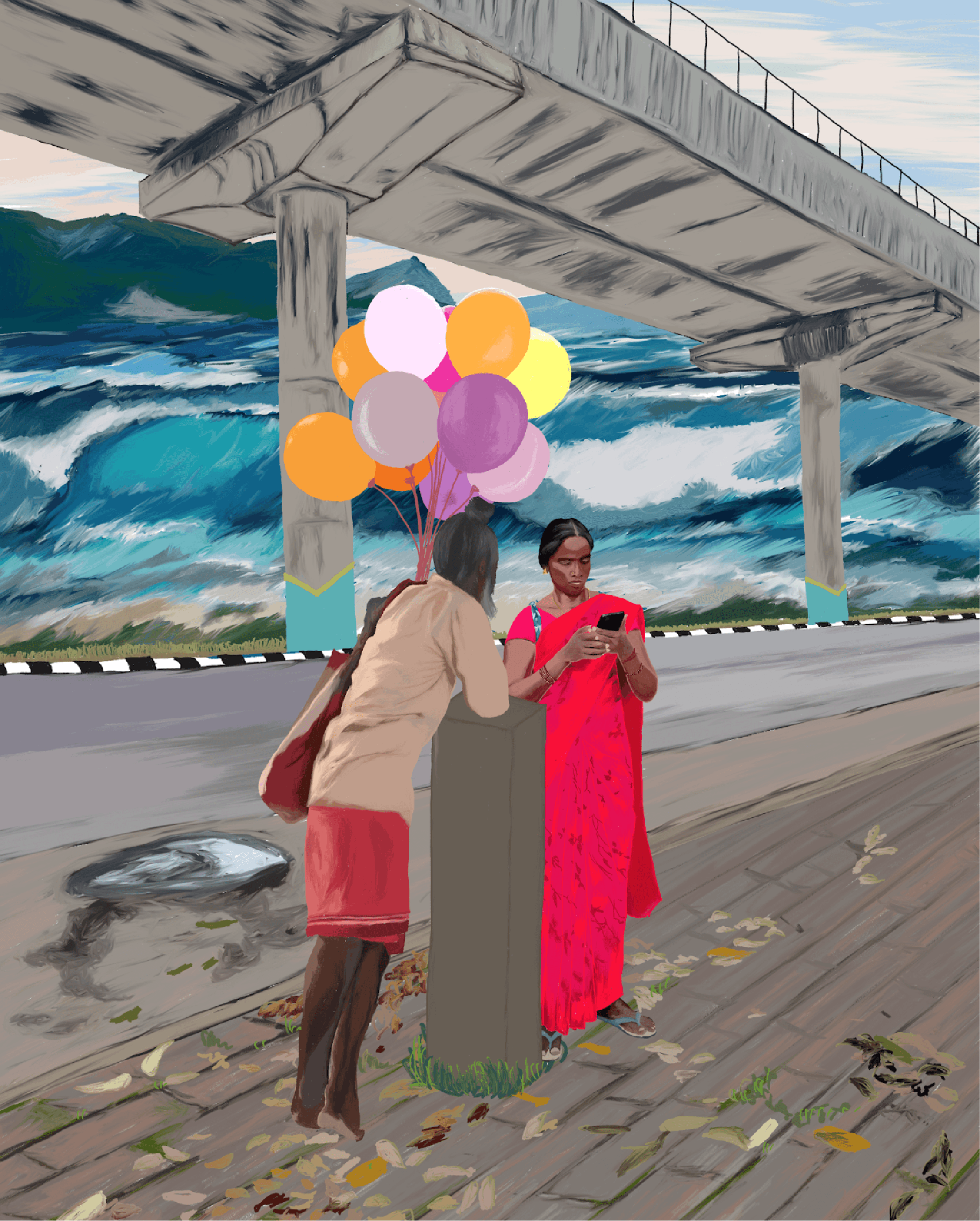 Them: Love & Care amidst precarity and chaos of survival. Beside the Salem-Kochi highway, near Edappally, one a balloon seller, familiar presence near Ernakulathappan Ground and the other, a construction worker I once noticed resting at a bus shelter in Vathuruthy. The metro—a symbol of mobility and modernity—contrasts with the ocean, restless and unpredictable, revealing the coastal fragility beneath Kochi’s development narrative.